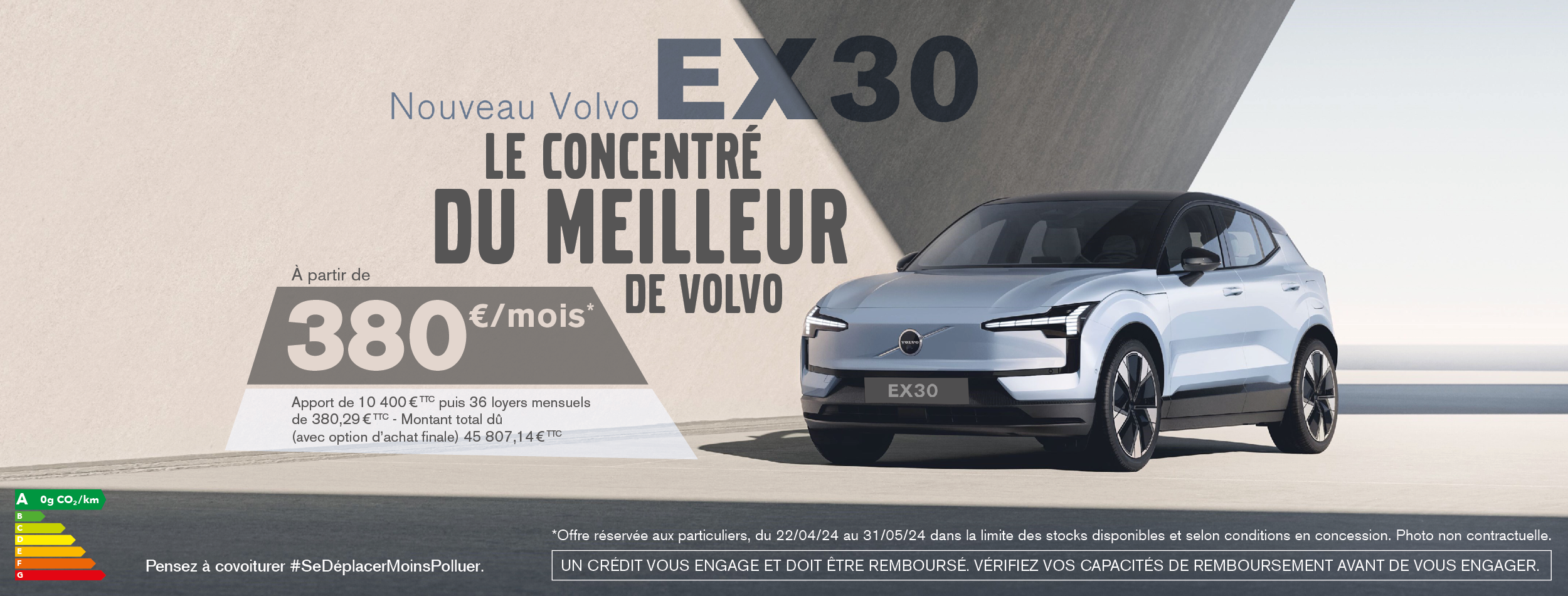 Offre de location avec option d’achat pour un véhicule neuf VOLVO EX30 START SINGLE MOTOR RW au tarif promotionnel de 39513,76 € incluant une remise de 1420 € hors assurance facultative. Carte grise et frais de mise à la route inclus. Offre réservée aux particuliers, valable jusqu’au 31/05/2024 et dans la limite des stocks disponibles.